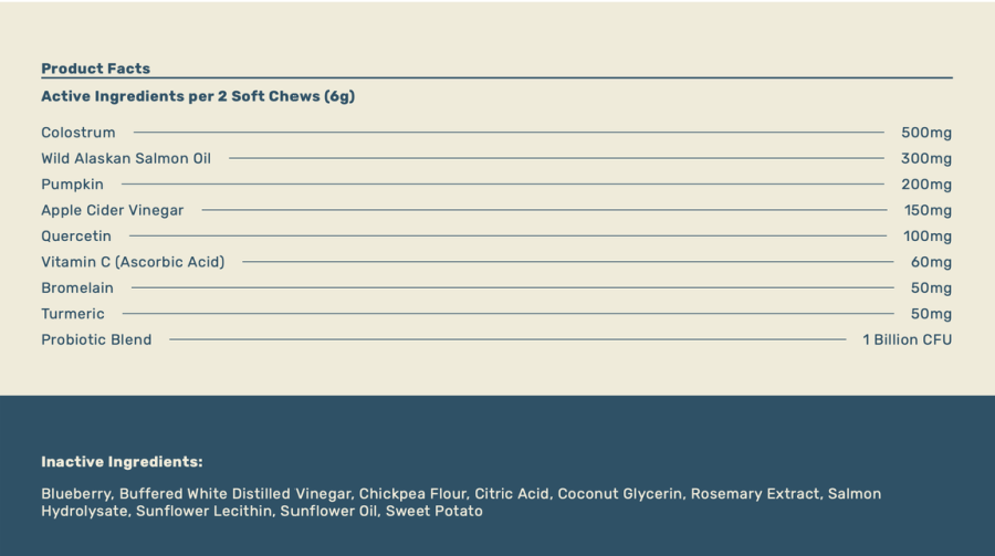 As you can see…. these are amazing chews that will provide results. My dog Jax loves them and his paw licking has been reduced after just two to three weeks of taking these and I cannot wait to see the results after a full month and more. I love that there are NO artificial colors, preservatives and ingredients, NO grain, corn or soy derivatives, that they’re made right here in the USA, made with natural and premium ingredients, and they’re recommended by veterinarians! The main ingredients are Wld Alaskan Salmon Oil (contains EPA & DHA – Omega-3 fatty acids help support skin health), a Three-Strain Probiotic Blend (Helps regulate the immune system and supports gut health & digestion), Colostrum (Contains essential antibodies to support a healthy immune system), and Quercetin + Bromelain (May help reduce itch-causing inflammation & support a normal histamine response). Take a look at the ingredient list below…. Â nothing that you cannot pronounce and that is super important to me.