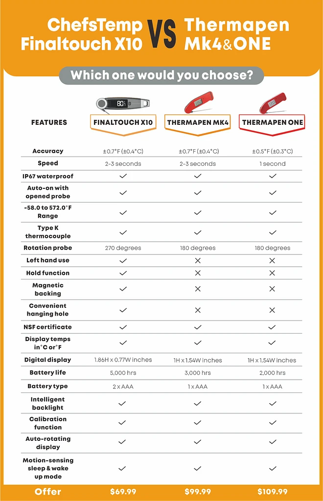 The ChefsTemp Finaltouch X10 beats the Thermapen in so many areas for me….starting with that price difference. The ChefsTemp Finaltouch X10 has the better display, it has better usability as compared to the other Thermapen models and it provides a better battery life PLUS it is a available at an insanely amazing price. Add to that the features that the ChefsTemp Finaltouch X10 has listed above that the Thermapen does not… and the ChefsTemp Finaltouch X10 Meat Thermometer is the clear winner. This unit pays for itself in all of the meat you will save by not overcooking them. Check it out for yourself and pick one up as it is the must have culinary tool for any home chef and cook and will ensure your meats and seafood are cooked to perfection… each and every time. This bad boy makes the perfect gift too for many on your gift giving list…..so check it out today!