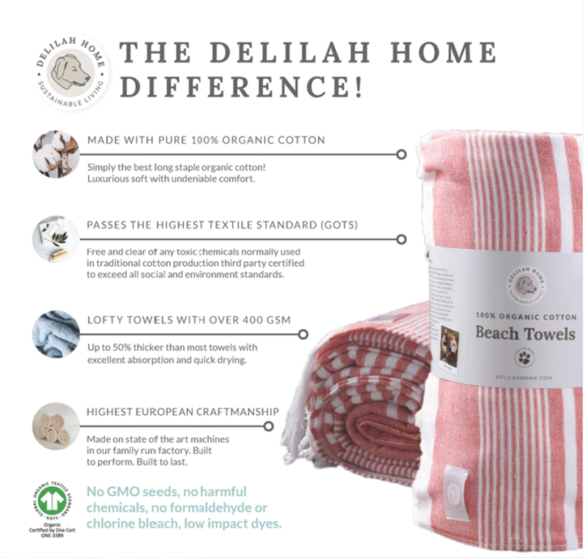 These towels work perfectly at drying you off as they are made with long-staple, 100% Organic Turkish Cotton that is spun into fine yarns and then loomed into long, 2-ply, double loops, resulting in a fluffy pile that looks and feels amazing on your skin. They are extremely thick and durable with over 40 gram weight and over 50% thicker than most beach towels plus Delilah Homes Turkish Cotton is certified to the Global Organic Textile Standard (GOTS) which I love and that makes me feel good. This certification means the product uses no chemical dyes or bleaches during cotton production and it means that you can feel better knowing your towel is completely non toxic and harsh chemical-free!