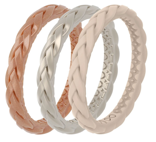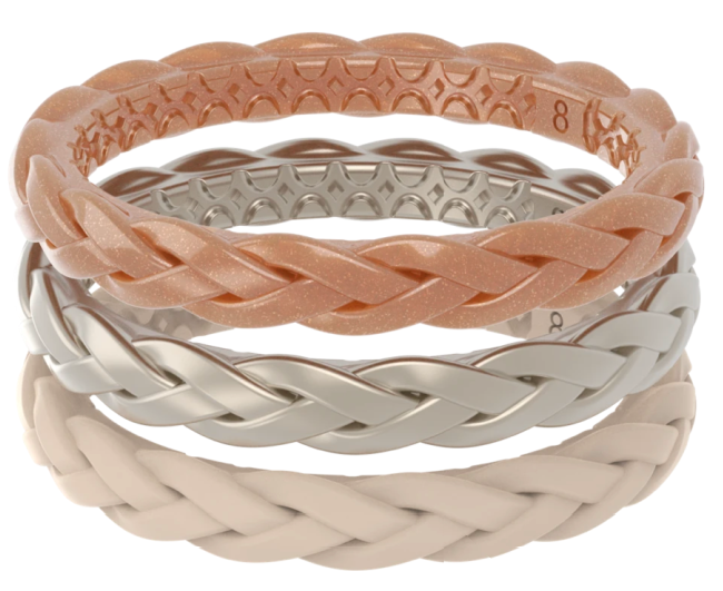 This Limited Edition Mirage stackable ring set is their new braided combo with neutral tones of copper, white gold and cream. Their fabulous lightweight design makes then easy to slip on and off whenever you need to, and these breathable rings will be an eye-catching addition to your everyday outfit… and is perfect with casual outfits and even for business.