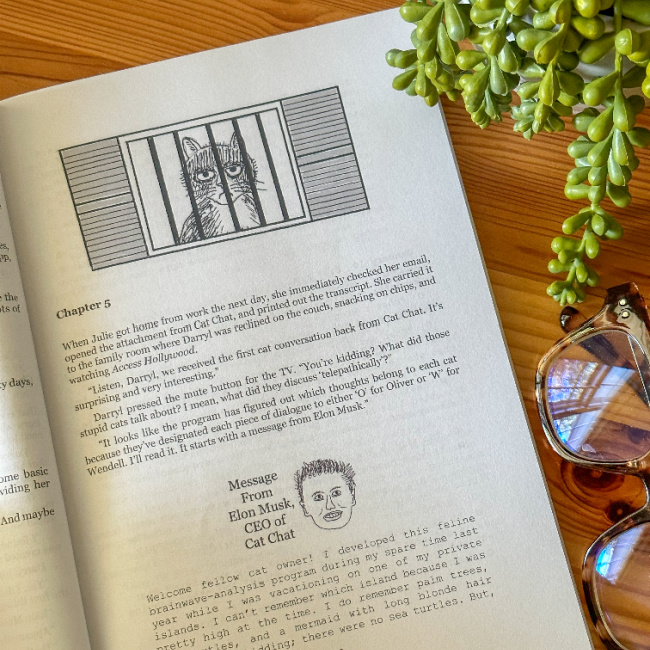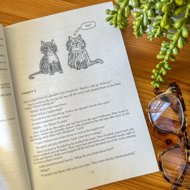 Julie decides to give Cat Chat a try because she has a 30 day free trial and in each chapter of this book, Julie finds out more and more about what her cats are thinking. She also finds out some amazing stuff about her feline companions. She finds out that both Oliver and Wendell are exceptionally smart and that they philosophize about life, understand Spanish, and even know history and some pop culture. The cats also have hilarious “conversations” about every cat behavior from chasing mice to grooming to using the litter box and what’s more, the cat thoughts reveal that Julie and Darryl each have secret relationships that they’re hiding from each other!