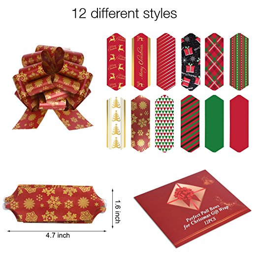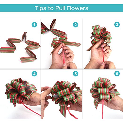 SKINOSM Christmas decoration pull bows come with 12 pieces with different patterns for each. It only takes seconds to pull the inner two ribbon strings to make the perfect bow or flower shape. As I mentioned above,,, the double-sided pattern adds extra value and quality to the bows and makes them much thicker, substantial and stable. You can fluff them out beautifully because of the great quality of the bow itself. These bows are perfect for Christmas gift wrapping, gift hampers, as party decorations, to use on Christmas trees, wine bottles, crafts and more. These are a perfect size…. 1.6 inch diameter, 40.2 inches long from top of bow to the bottom of tails and there are 9 loops in each bow. Plus SKINOSM offers an unconditional money back guarantee! If you are unhappy for any reason… they will refund your purchase price. I love it when a company stands behind their product!