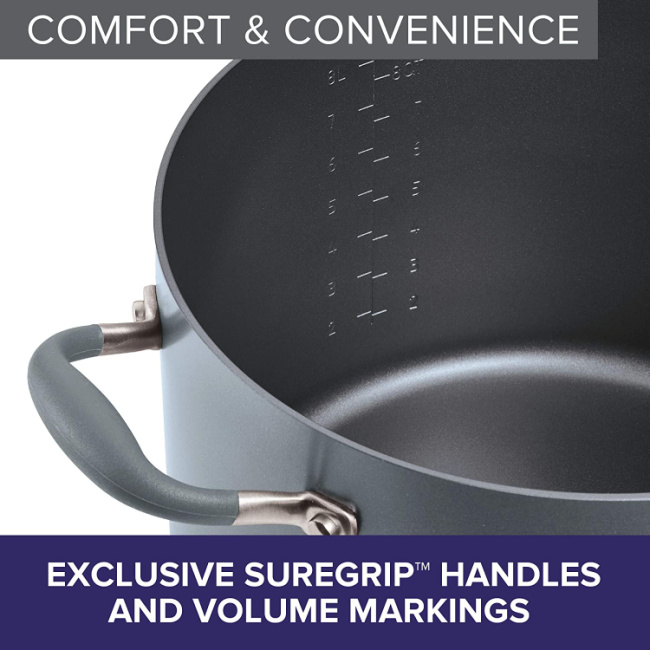 *Easier: Move around the kitchen with confidence with durable SureGrip® handles for a secure and comfortable hold. Built in measuring marks on saucepans.