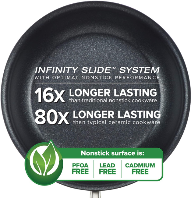 *Smoother: Sapphire-reinforced Infinity Slide™ nonstick makes cooking a joy and cleanup quick and convenient. Your eggs will be skating 16X longer than traditional nonstick.