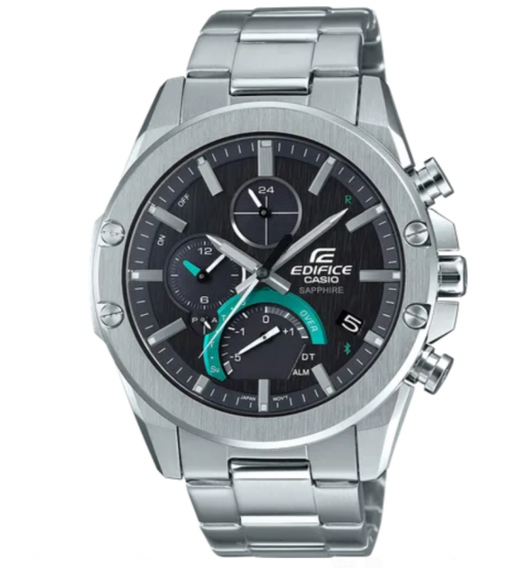 From the Casio Edifice Collection, the Casio Edifice EQB-1000D is a men’s chronograph watch that features a black dial with silver-toned hour, minute and second hands, plus a trio of sub-dials for viewing 24-hour time, dual time and day, and date display. I love the added touch of teal and silver-toned accents and all within a brush-finished bezel and face and sapphire crystal in a slim 49.9 x 45.6 x 8.9mm stainless steel case.