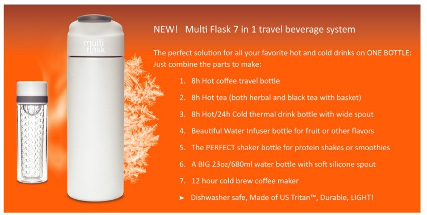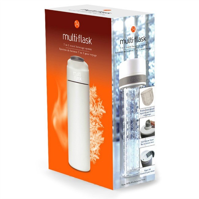 The Multi Flask 7-in-1 Travel Beverage System is perfection as you use the 2 included Multi Flask bottles and easily swap the various parts to create 7 specialized bottles without all of the unnecessary clutter in your cupboard from 7 bottles. This bad boy is like the Swiss Army of water bottles.