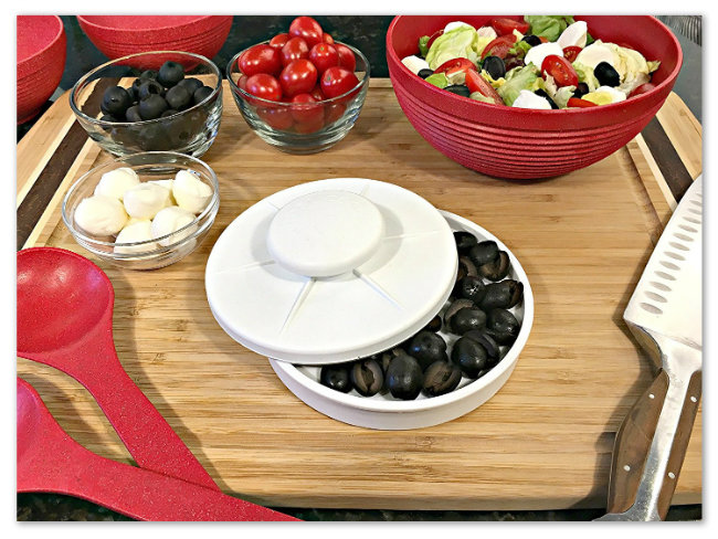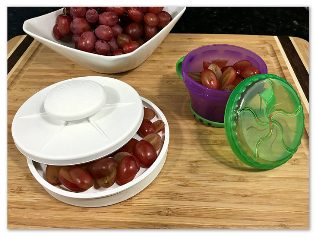 What a great tool! I’ve been struggling with cutting grapes and olives by putting them under a small cutting board but they always seem to roll away before I get to the cutting. This is a much better idea.