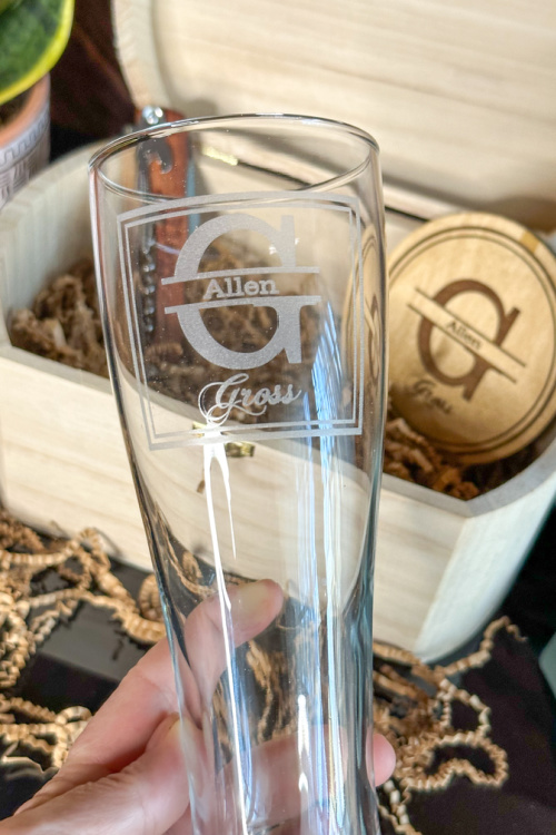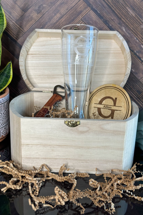 You can see the personalized goodies contained within this Personalized Pilsner Gift Box and you can see that everything is beautifully hand crafted to perfection. It truly makes the ultimate gift.