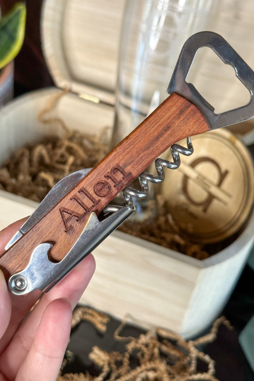 I have to say that the personalized Corkscrew and Bottle Opener that comes with the set is gorgeous! My husband loved this piece and it simply states his name on the handle. He loves whipping this one out anytime that he needs too especially when his best friend comes over. He loved the set so much that he wants one which is why I will be picking a set up for him later this year for his Birthday.