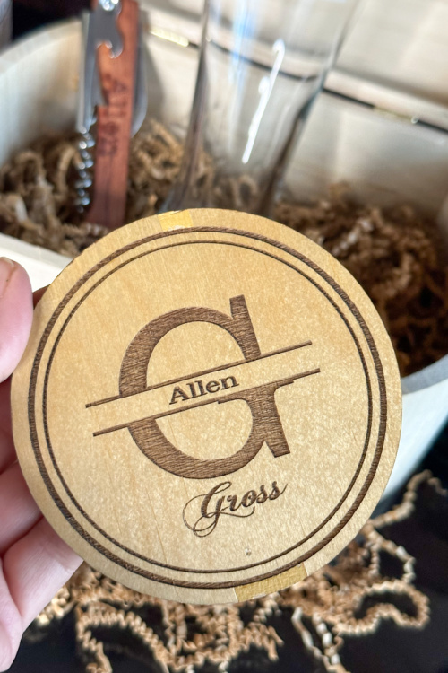 You can also see the beautiful coaster that this gift set comes with and it is personalized to match your glass personalization…. actually all pieces in the gift set are personalized the same and it is such a beautiful set that makes the perfect and most unique of gifts.