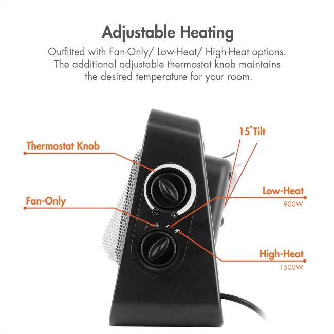 The Tenergy Personal Heater has a 15 degree fan tilt which allows me to direct the air up towards my preferred area of focus… which for me will be my legs when I am at my desk. I love that the control allows me to choose Fan Only as well as Low Heat (900W) & High Heat(1500W) functionality…. which allows you to be in control of the amount of heat coming out of the unit. The additional adjustable thermostat can be set to maintain the temperature in your room to your liking and this little heater is one of the best portable heaters for home, office and/or bedroom.