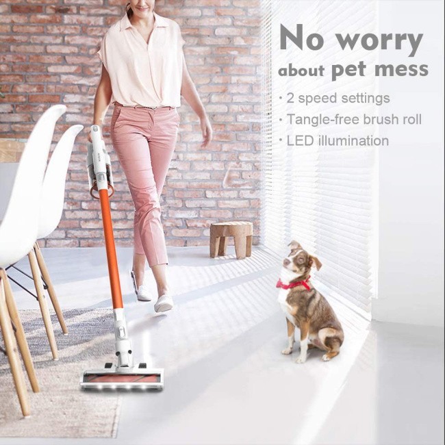 This cordless stick vacuum is amazing on hard floors… and low pile carpets. It uses a self-cleaning brush roll, which picks up all kinds of embedded debris and dust in its path. I also love how flexible it is as it allows you to swivel around and under furniture and cabinets while the LED light illuminate the particles, which helps you to ensure a good clean, leaving nothing behind.
