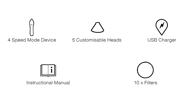 You receive everything that you will need with the Microglo Microdermabrasion Kit including the unit itself and 5 changeable heads. You receive one that removes oils and blackheads, one for the different skin types…very sensitive skin, sensitive/moderate skin, coarse skin, and another for body & feet.