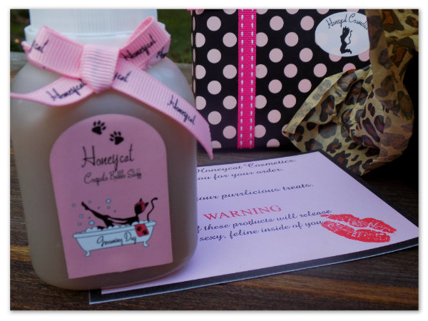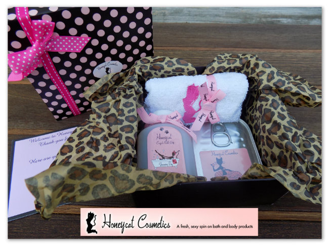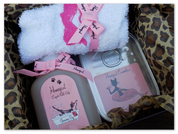 This is the cutest gift set ever! I am just loving it and let me tell you…. Honeycat Cosmetics carries a fabulous selection of amazing gift sets as well as individual products. They carry Shower Gels, Scrubs, Bath Bombs, Mini Bath Bombs, Bubbles Bubbles Bubbles, Creams and Butters, Salts and Soaks, Luscious Lip Stuff, Kitty Treats as well as clothing. They even have a Gift Registry…. how cool is that? So do need some pampering or are you looking to gift a fabulous gift set to someone special? Well……you must visit Honeycat Cosmetics for yourself and you will fall in love just like I did!