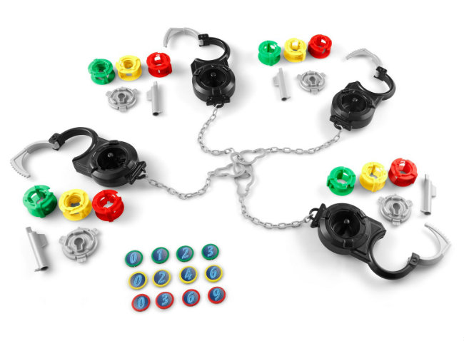 First, players handcuff themselves together and insert a maze into each handcuff. The game includes three maze colors. Each color represents a different level of difficulty, making each round new and different. Using the lock pick, players must try to pick the lock on their handcuff as quickly as possible. The fastest to break free from their handcuff receives a token that corresponds with the maze color. There are points on the back of each token, the player with the most points after playing all three rounds, wins the game.