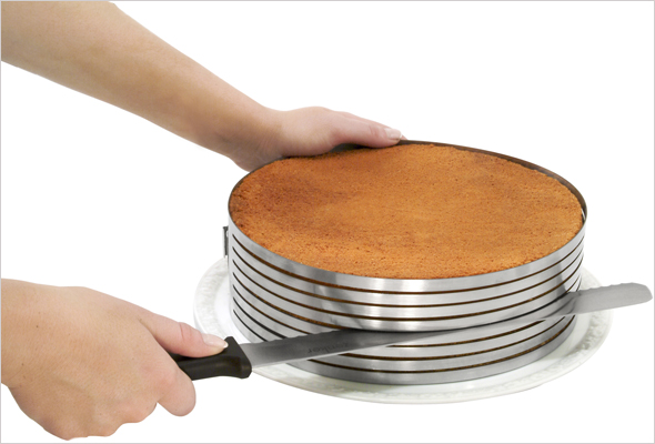 I am loving this culinary tool for my cake baking and frosting needs! The Frieling Stainless Steel Layer Cake Slicer is a breeze to use and with amazing results! With this set you receive 3 pieces: The adjustable slicing mold, the 12″ baker’s knife, and the 11″ cake lifter. Using this kit makes slicing uniform layers a “piece of cake”! You can slice up to 8 layers in total with this mold… but you only have to use 2 or 4 layers if desired… actually any amount you need (up to 8). It is really easy to work with and a fabulous tool to add to my culinary tool collection.