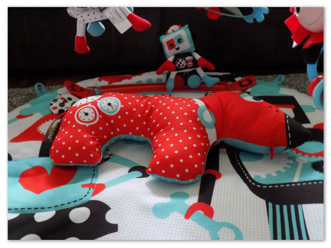 Is this not the coolest thing you have seen? I just love the track that they use to play music as well as provide the motion which stimulates baby to interact and play with the different toys. This unit features dual music modes (“Rest” & “Play”) with 10 minutes of consecutive tunes and music, as well as a mute mode for quiet time play. The easy-attach track affixes to the straps on arches and the actual mat for multiplay positions. The robot figures and the mirror can attach easily to the battery operated buggy on the track to engage your babies curiosity and promote physical development which is so very important. The double sided “Tummy Time” pillow provides support for baby during their tummy time workout. I love love love the fact that the Gymotion Playland can be easily configured for 3 different stages of development….. so basically you will use this for quite some time. And I just love it as does Scarlett!