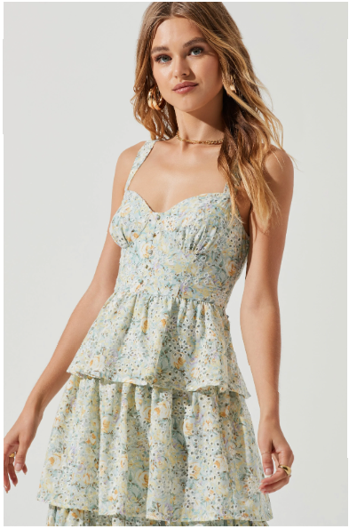 This dress features a pastel floral print overlay that is tied in an eyelet. Its round neckline and button-down front are then covered with a cupped bust and a covered button down bodice. A round skirt with a front slit also features a mock back and adjustable shoulder straps.