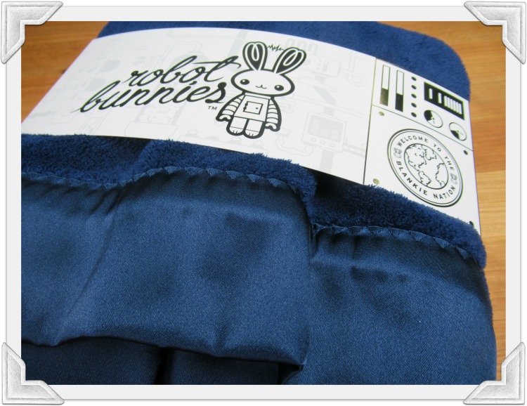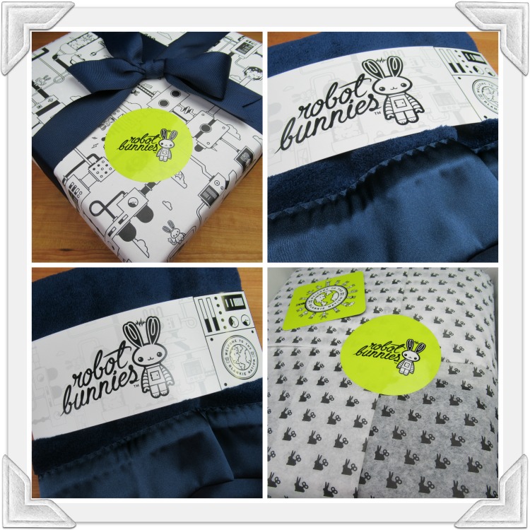 I was so impressed when I received my Robot Bunnies baby blankie in the mail. It was wrapped beautifully with the cutest paper both inside and outside of the gift box and the feel of the Robot Bunnies blankie was so soft and luxurious… I would want an adult size one for myself! Robot Bunnies blankies combine super soft polymicrofiber with luxurious satin trim so that they look and feel fabulous. Robot Bunnies fabrics are lush, high quality and super easy to keep clean too. You can simply wash in your washing machine on the gentle cold cycle and then dry flat or you can fluff in the dryer on the lowest heat setting.