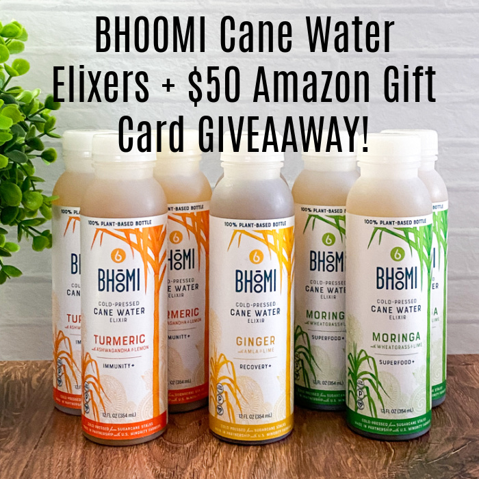 So what do you think of these delicious Bhoomi Cane Water Elixirs? They’re truly the perfect way to stay hydrated all summer long as cane water is a traditional Indian Ayurvedic beverage, used for centuries for hydration and as a natural source of low-glycemic energy plus add to that the powerful phytonutrients, electrolytes, B vitamins and functional ingredients that each variety contains and you have a powerhouse of a drink that refreshes and revitalizes me after a hot summer day. Make sure you visit Bhoomi Cane Water Elixirs online and check them out on Social Media PLUS continue reading to learn how you can enter to win 9 Bhoomi Cane Water Elixirs to try plus a $50 Amazon Gift Card! Enter Today & Good Luck!