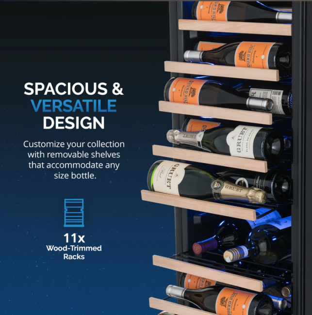 I also love the adjustable shelves that this wine fridge comes with. These shelves are all removable and adjustable so that the sleek-looking, well-built racks can accommodate regular or larger-than-standard bottles.