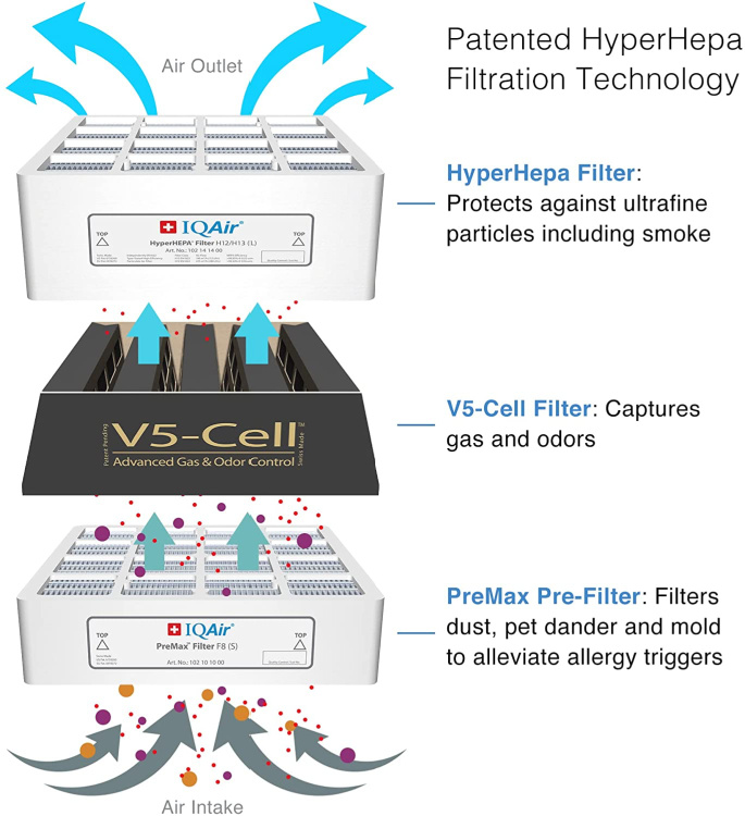 The IQAir HealthPro Plus is the #1 rated room air purifier for allergies and asthma and it has received more top reviews and awards than any other air purifiers on the market. This has a lot to do with the systems HyperHEPA filtration. The IQAir HealthPro series features HyperHEPA filtration technology for excellent airborne particle removal. This filtration is tested and certified by an independent third-party lab to filter 99.5% of harmful ultrafine pollution particles down to 0.003 microns in size. This is 100 times smaller than 0.3 microns which is huge.