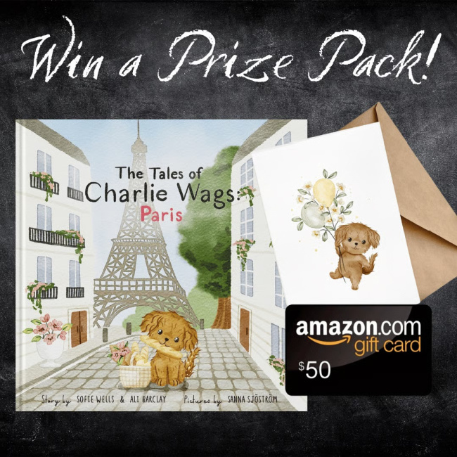 Enter our giveaway for a chance to win a signed hardcover copy of The Tales of Charlie Wags: Paris, a collection of adorable Charlie Wags greeting cards, AND a $50 Amazon gift card to fuel your next reading spree!