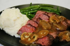 Six ounces of grilled breast of chicken topped with portobello mushrooms in a paleo rich gravy. This is a Paleo meal option and I added Smashed Red Skin Potatoes with butter and a side of zucchini. Delicious and came with a side of gravy so that you could dress the chicken and potatoes after heating the meal. I love that option!