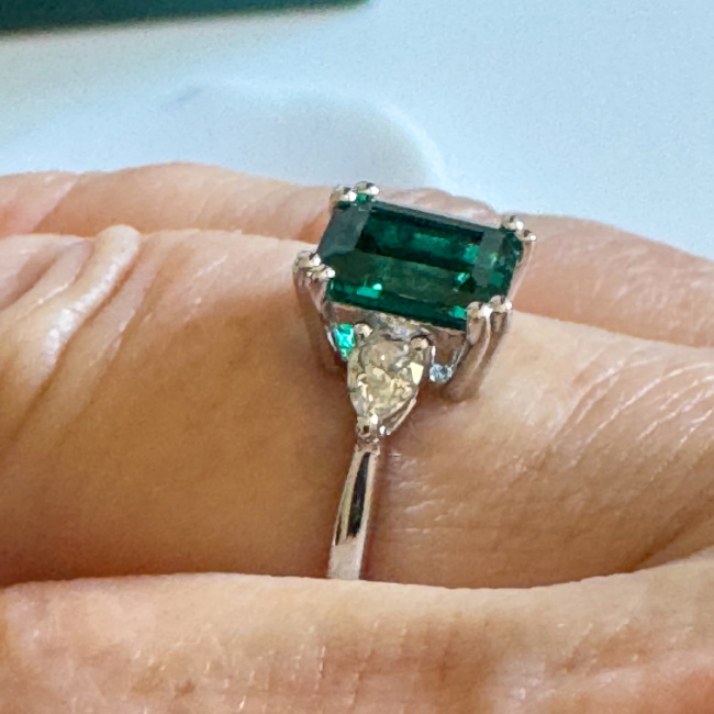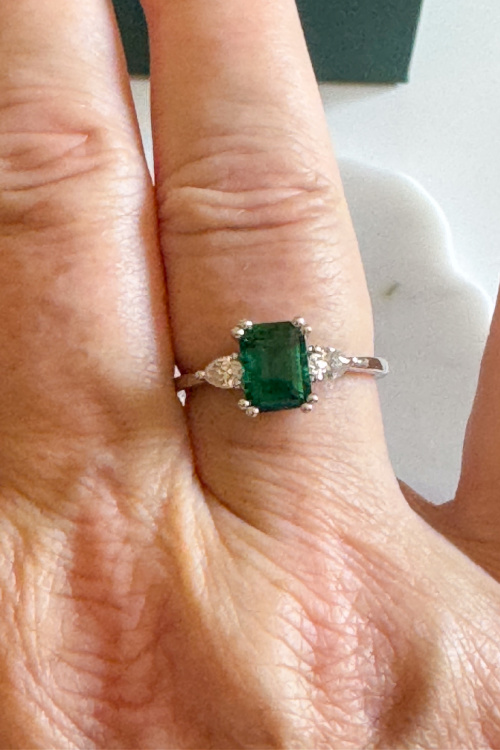I love that this gorgeous ring is made with 14K white gold ring and with three beautiful with stones. You have the emerald cut Emerald in the center and it’s is flanked by two Moissanite Pear shaped stones that are absolutely gorgeous. Those two Moissanite stones really make that Emerald in the enter stand out.