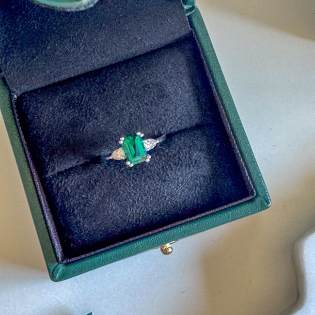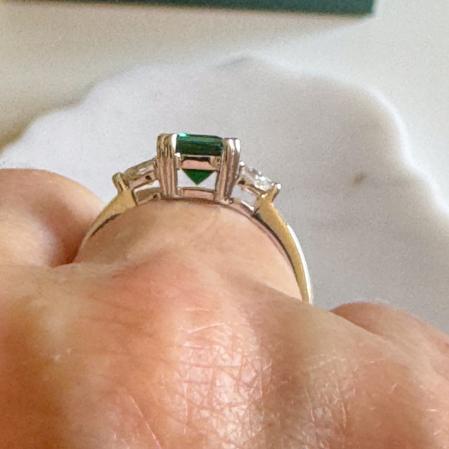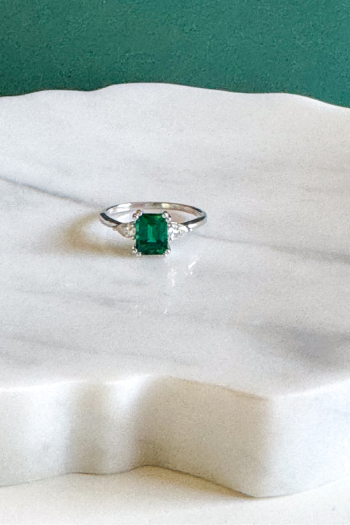The main stone in this gorgeous ring is the Emerald and it is a 6x8mm emerald cut lab emerald which I appreciate as I am all about sustainability so lab grown pieces are perfect for me. It is so gorgeously crafted that no one would ever be able to tell that it wasn’t real!