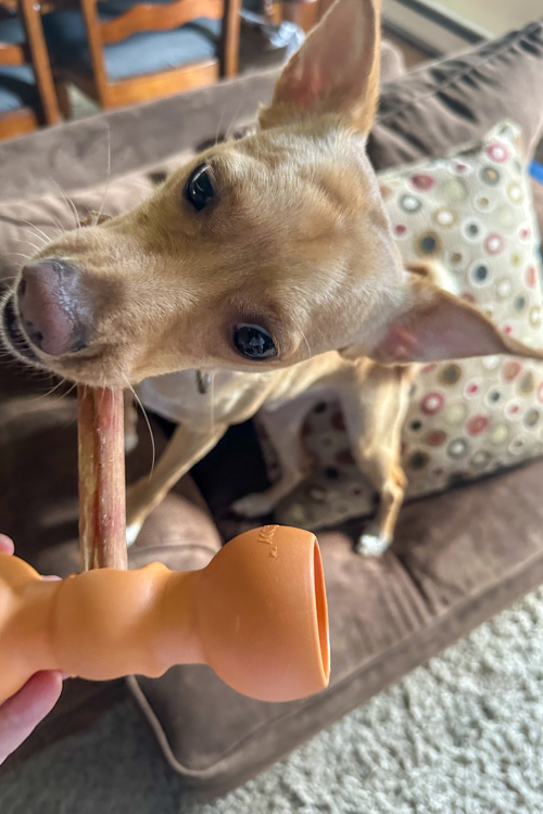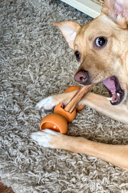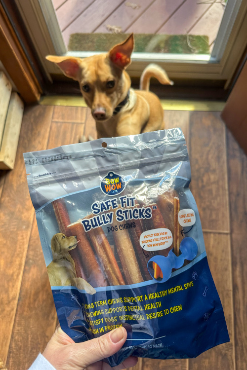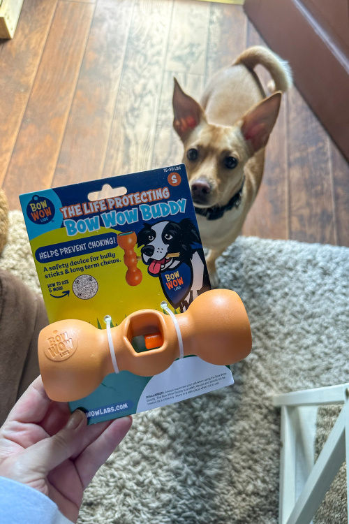 If you read my blog often, then you know that about a year ago my family and I rescued Jax, our newest furry family member. He is a Mountain Feist that was rescued from a high kill shelter in Alabama and we were lucky to have found him at a shelter in New Jersey last year when we were in search of a new dog. Jax is a much loved addition to our household and I’m seriously obsessed with him and just love hanging with him each day. He lays in his dog bed next to my desk in my office while I work throughout the day or he hangs out with with my daughter in her room. No matter where he ends up hanging out in our home, you can rest assured that he has his favorite chew toy with him and also delicious long lasting chews of some kind to enjoy. His favorite long lasting chew of choice are for sure bully sticks which is why I wanted to work woth Bow Wow Labs to give their products a try including their ingenious Bow Wow Buddy which is a safety device designed to protect your dog by holding the bully stick (or any other long-lasting chews) in place securely. This device allows your dog to safely enjoy their bully stick or other types of long lasting chews safely without the risk of choking on that last piece. Let’s take a look at why I am loving the piece of mind that Bow Wow Labs products provide and why they’re my go-to for my dog’s favorite long lasting chew needs.